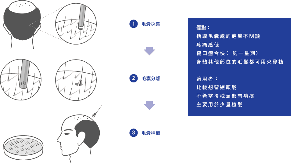 頭部後下方的取髮區域會有一不明顯的疤痕,採用最新頭皮縫合的觀念以及可吸收線的材質,術後不須拆線,加上該區域頭髮的覆蓋,通常很難發現疤痕。很多病人開玩笑地告訴我們,他們的理髮師都無法發現疤痕,而接受植髮的區域是完全沒有疤痕的。